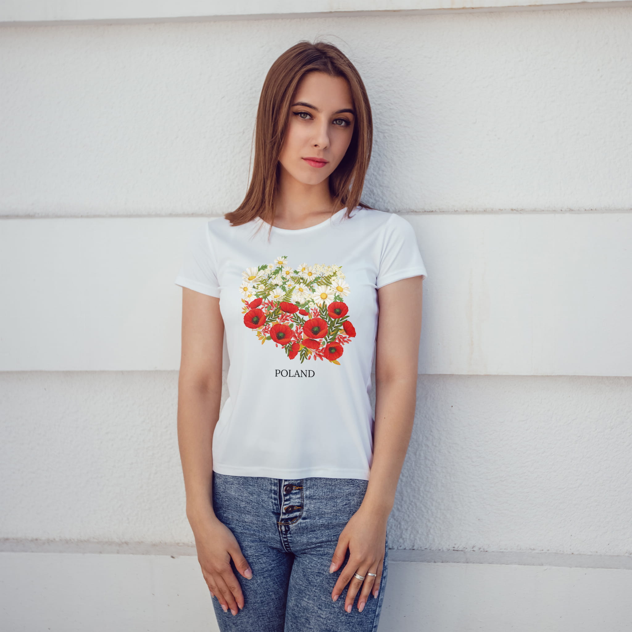 Koszulka damska bawełniana z motywem Polski – biały T-shirt z kwiatowym wzorem