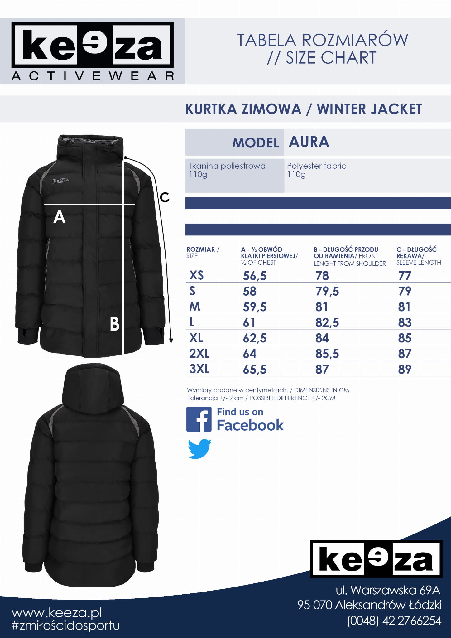 - Podszewka: Tkanina z wykończeniem "peach skin", 100% poliester, 65 g.