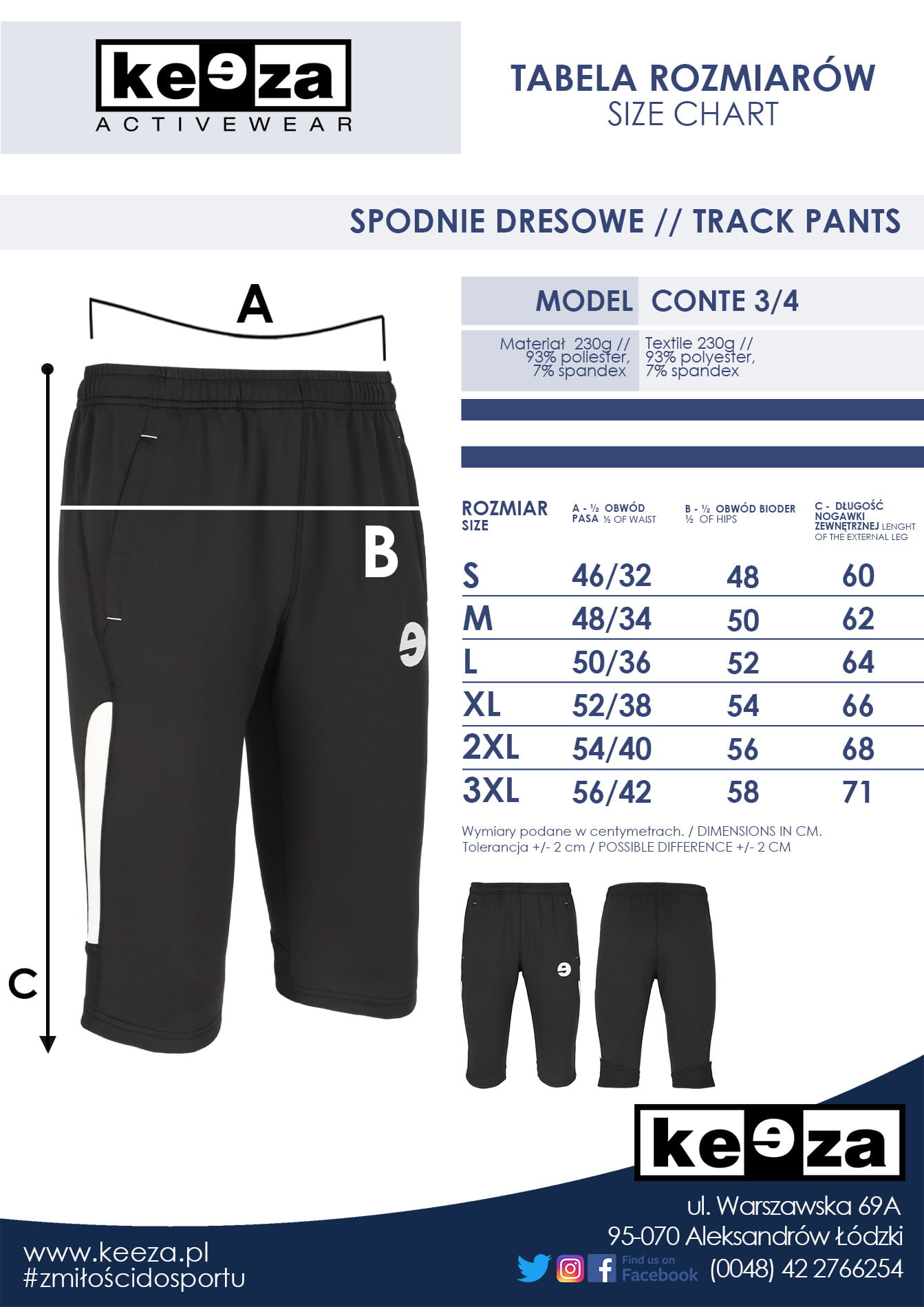 Spodnie o długości ¾ posiadają dwie boczne kieszenie zamykane na suwak, sznurki w pasie do regulacji obwodu oraz zwężane nogawki. Charakterystyczne dla linii #KEEZAElite dwa boczne pasy na nogawkach w kontrastowym kolorze nadają modelowi CONTE sportowego stylu.